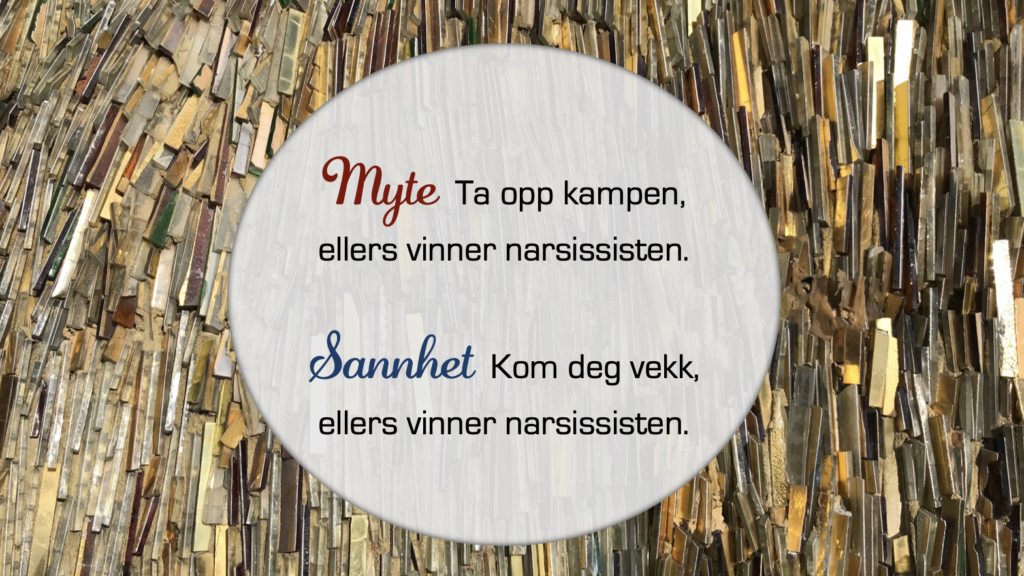 Jeg har en holdning til det, som nok ikke er mainstream. Grunnen til at jeg mener det jeg gjør om dette, er at jeg i flere år har jobbet med å lære folk om hvordan de håndterer narsissister. Jeg har for det meste jobbet med skilsmisser, men kunnskapen jeg har ervervet meg herfra, er fullt anvendelig på andre arenaer.